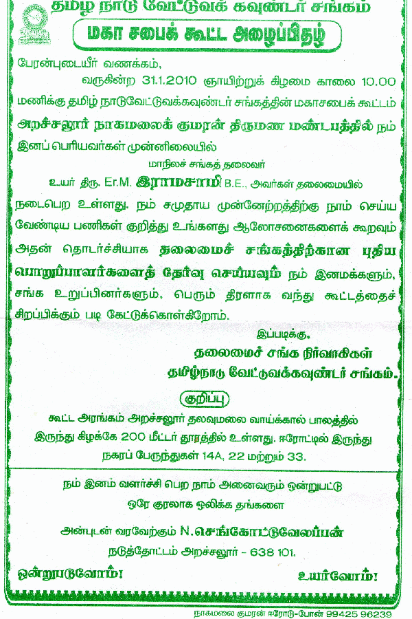 On 31st Jan 2010, our Vettuvagounder Sangam decide to elect the new office bearers for uplifting our community. The Venue is Nagamali Kumaran Thirumana mandam in Arachular under the supervision of Er. Ramasamy, Veteran Vettuvagounder President.